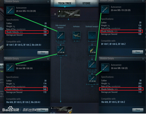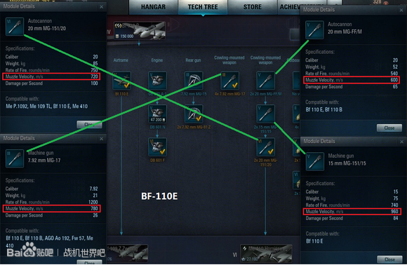 3、不同口径的机炮机枪混装,一定要注意看各个机炮机枪的【炮口初速】!!!不同类型的炮,打出去的炮弹速度不一致,不利于打提前量。